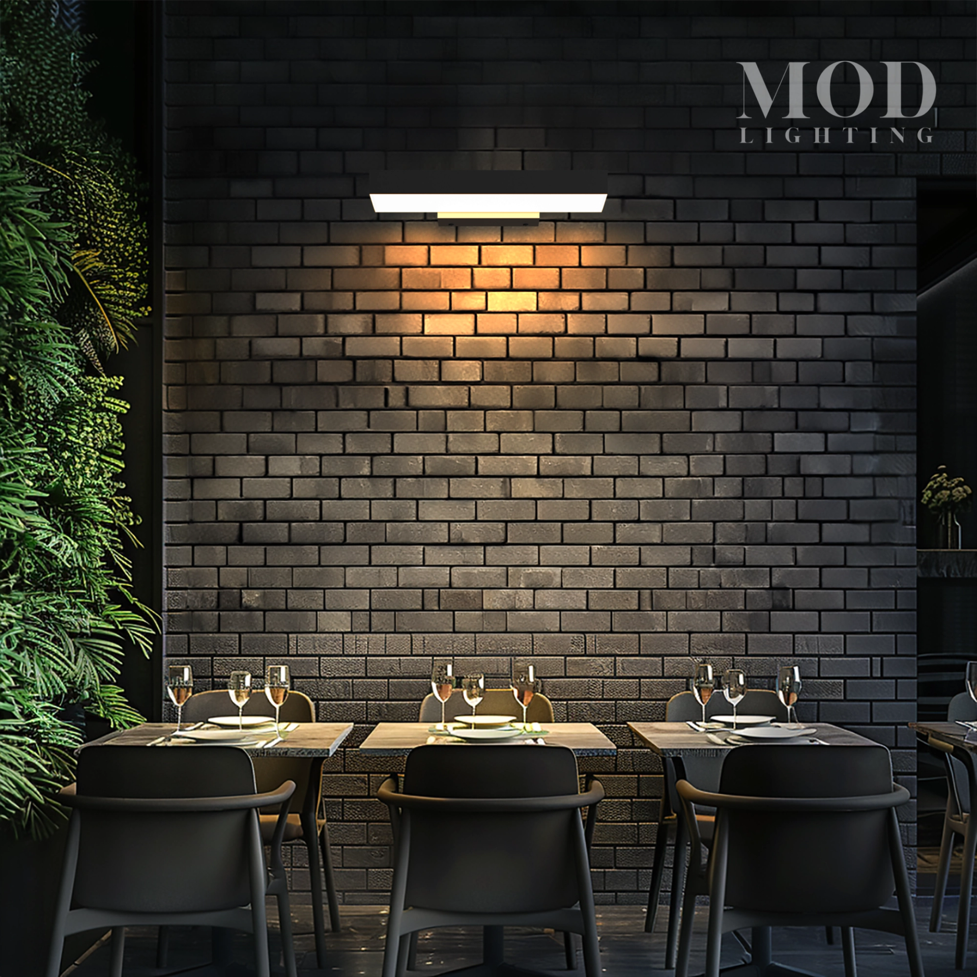 Fern is also an industrial-style fixture. Made from aluminum with a large LED strip visible from three sides and featuring a layered casing, it emits a strong illumination and ambience to a hallway or outdoor dining area.